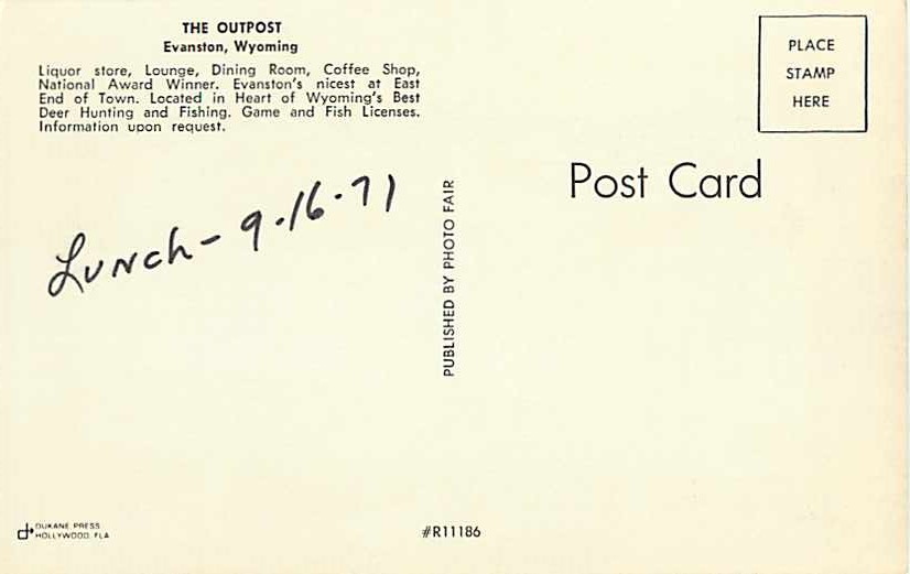 The Outpost in Evanston Wyoming WY Chrome......... Postcard Size: : 3 1/2 x 5 1/2 Inches..... Type of Postcard: Chrome..... Postmark: Not Mailed.... Condition: Very Good: has lunch -9 -16 - 71 in ink on t ... Read More