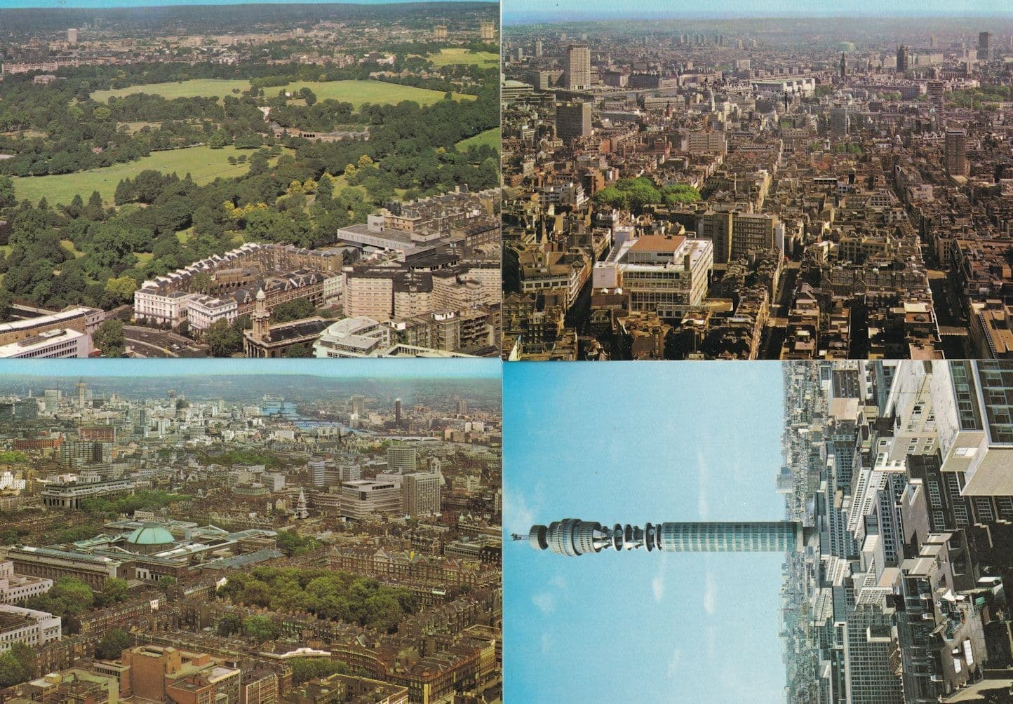 ts230 Four spectacular circa 30 years or more origin postcards of the Post Office Tower from the air all officially published by GPO so original souvenirs of the era all unused and mint