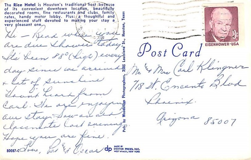The Rice Hotel Houston, Texas, USA Postcard - 1972