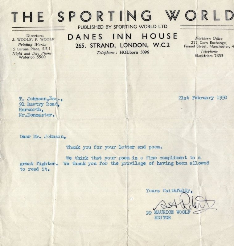 The Sporting World Newspaper 1950 Boxing Hand Signed Letter