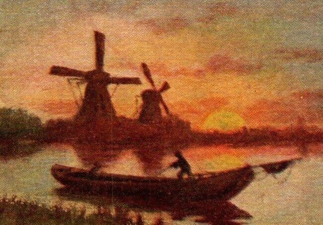 The Start for Home postcard 1909 Windmill Sunset boat Norway