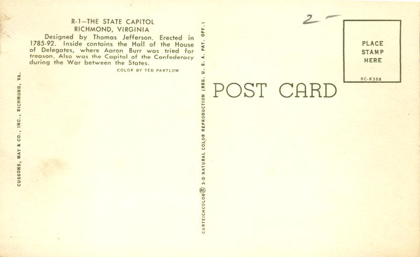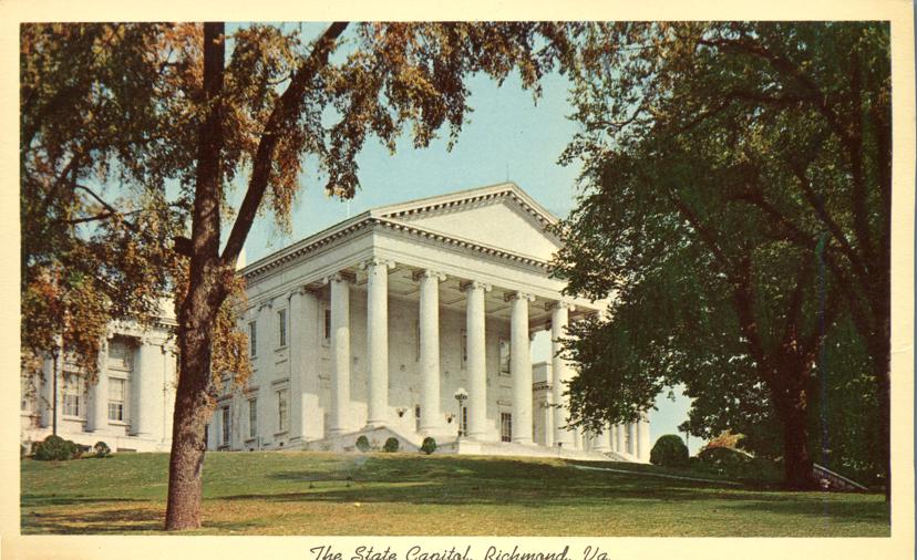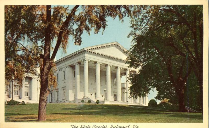 The State Capitol - RIchmond, Virginia. Standard sized chrome card. The Curt-Teich Dating Guide assigns 9C-K358 to 1959. Good condition.