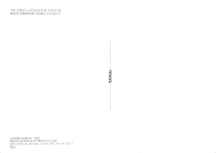 The Street - Alfred Stieglitz Grade: 1 Category: Modern Postcard, Continental Size, Approx 4 in x 6 in (10 cm x 15.25 cm) Product Size: Continental size: 4X6 inches (10.5 cm x 15 cm) Grading Scale: Grade 1 = P ... Read More