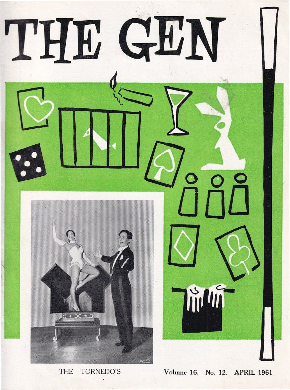tp351 This is for a vintage 1960s issue of The Gen magazine which was one of the greatest magic magazines of the era - each magazine is between 24-28 pages with features, tricks, photos, reports and news from the world of magic from that week etc and this particular issue is highly collectable as the front page photo is The Tornedos. It has light aging and some wear but good to vg condition. Throughout the magazine is tricks explained by the leading magicians of the 60s with pictures and photos.