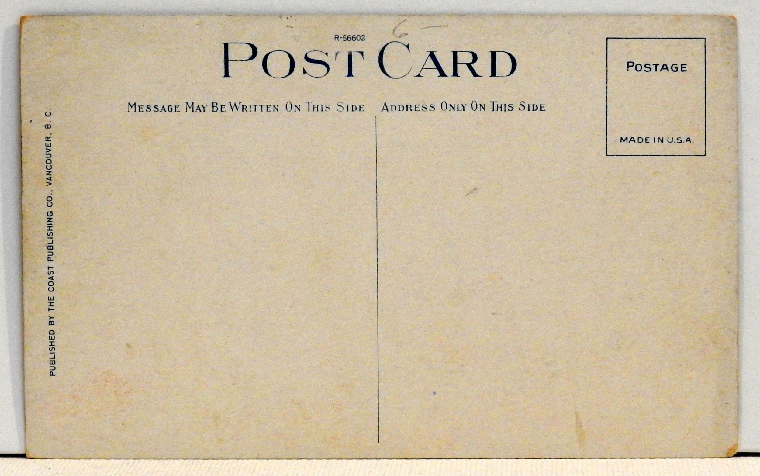 Lithograph Postcard; Waterfront; Stanley Park; Vancouver, British Columbia, Canada; published by Coast Publishing Co.; #R-56602; Trace of soiling, wear to edges and corners.