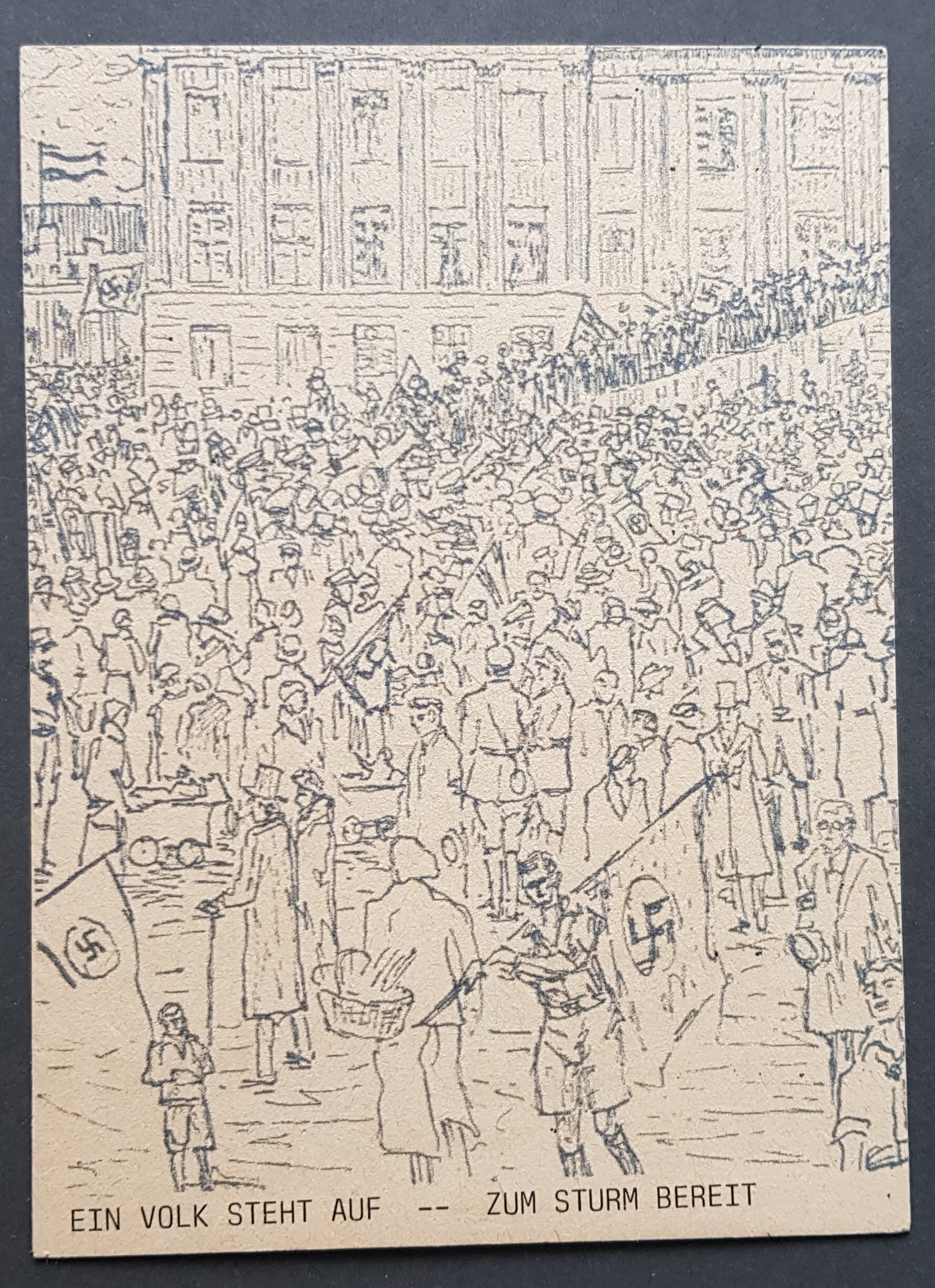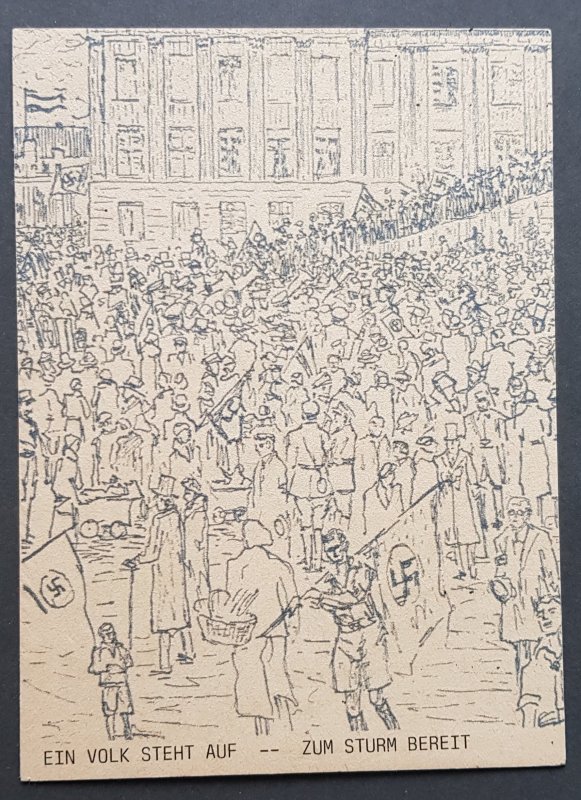 Propaganda postcard showing an artist drawing of ordinary German people with Swastika flags and the title 'A people get up ready for the storm', never seen offered before and any other information, unused as per the scans.Combined postage is available, please request an invoice before making payment.