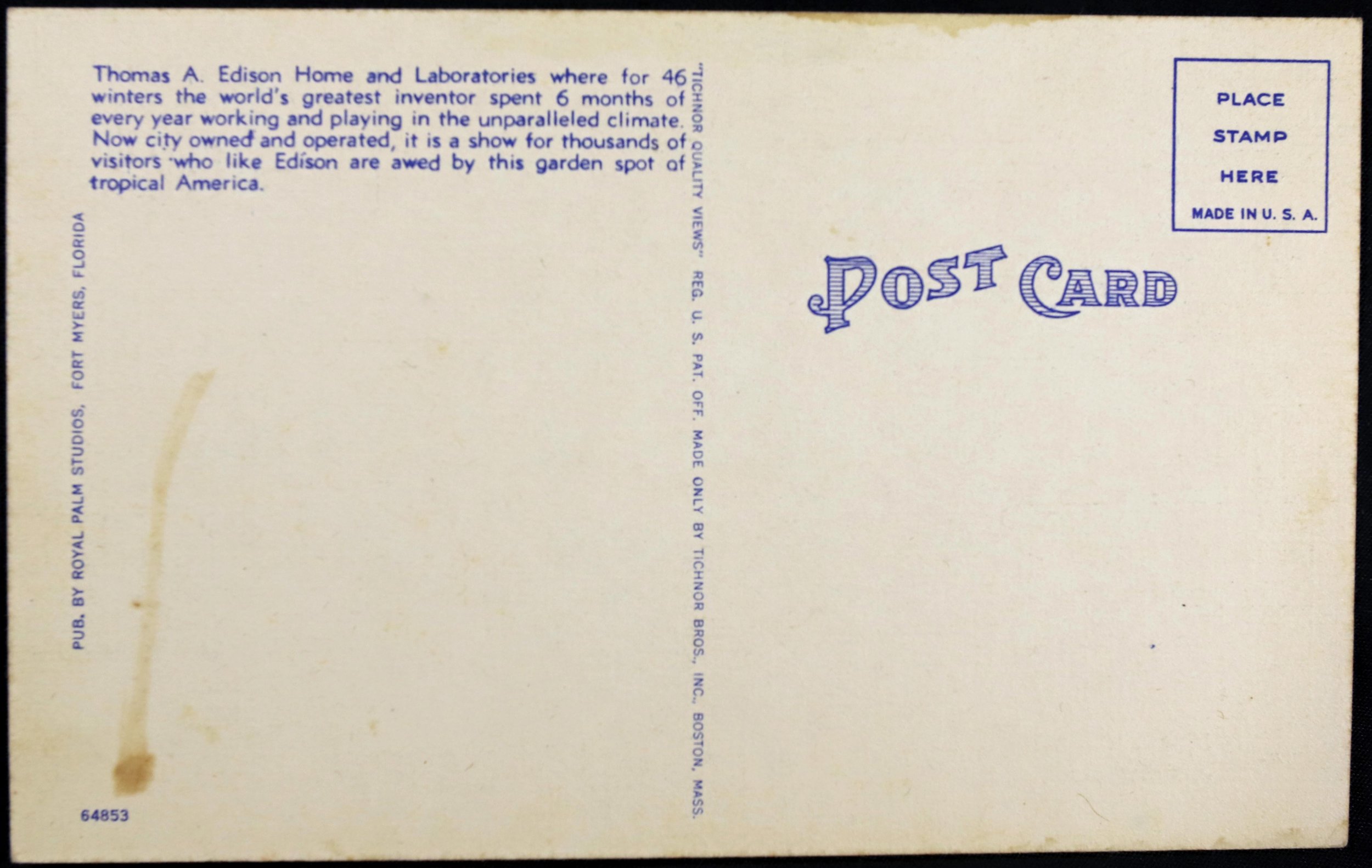 Thomas Edison's Home, Fort Myers, Florida Tichnor Bros, Boston Mass.Seller Information