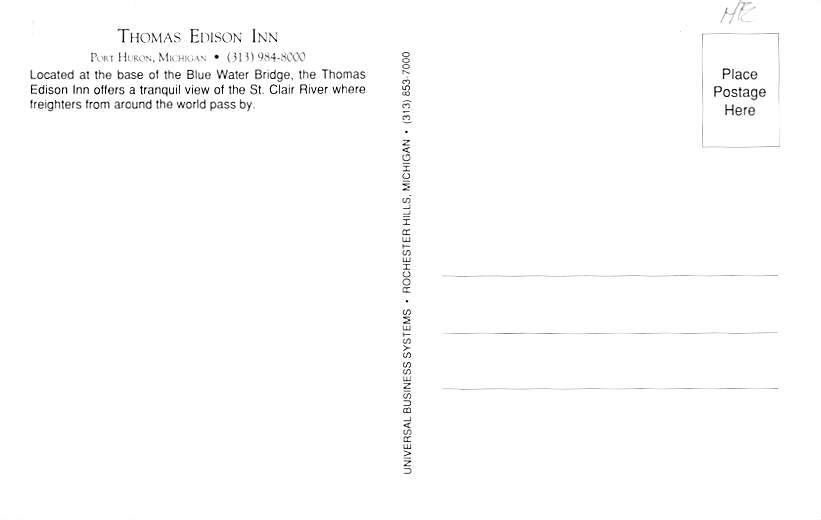 Thomas Edison Inn Saint Clair River - Port Huron, Michigan MI Postcard - Thomas Edison Inn Saint Clair River - Port Huron, Michigan MI Postcard
