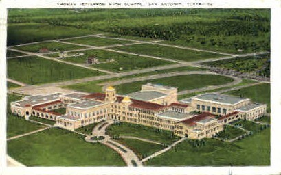 Thomas Jefferson High School - San Antonio, Texas Postcard - 1940 Grade: 3 Size: R - Regular size: Approx 3 1/2 X 5 1/2 inch (9 cm X 14 cm) Grading Scale: Grade 1 = Perfect corners Grade 2 = Very Minimal corne ... Read More
