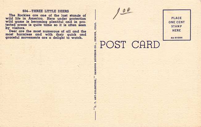 Three Deer in the Rocky Mountains. Copyright Northern Pacific Railway. Standard sized linen post card. The Curt-Teich Dating Guide assigns 4A-H1094 to 1934. Very good condition.