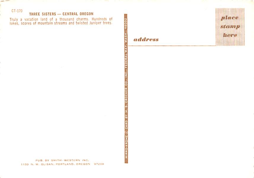 Three Sisters - Central Oregon Grade: 1 Category: Continental Size Postcard, Approx 4 in x 6 in (10 cm x 15.25 cm) Product Size: Continental size: 4X6 inches (10.5 cm x 15 cm) Grading Scale: Grade 1 = Perfect ... Read More