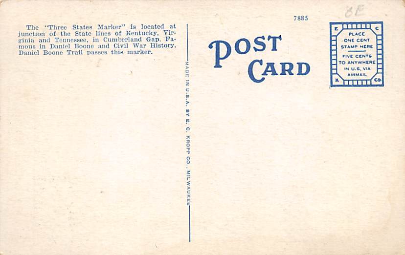 Three States Marker Middlesboro KY Postcard - Unused