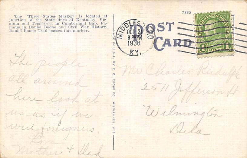 Three States Marker Middlesboro KY Postcard - 1936 Grade: 2 postal marking on front Size: R - Regular size: Approx 3 1/2 X 5 1/2 inch (9 cm X 14 cm) Grading Scale: Grade 1 = Perfect corners Grade 2 = Very Mini ... Read More