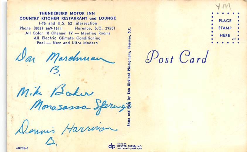 Thunderbird motor in Country kitchen restaurant Florence, SC Postcard - Writing on back