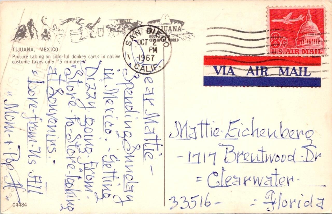 Tijuana, Mexico ZEBRA STRIPED DONKEY & CART Roadside Tourist Photo 1967 Postcard