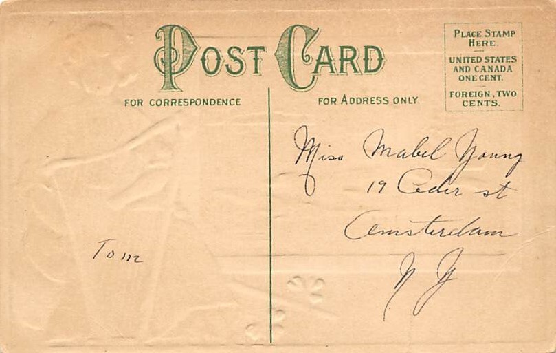 To Greet you St. Patrick's Day Postcard writing on back, Grade: 4, , Size: Regular size: Approx 3 1/2 X 5 1/2 inch (9 cm X 14 cm) Grading Scale: Grade 1 = Perfect corners Grade 2 = Very Minimal corner wear, no ... Read More