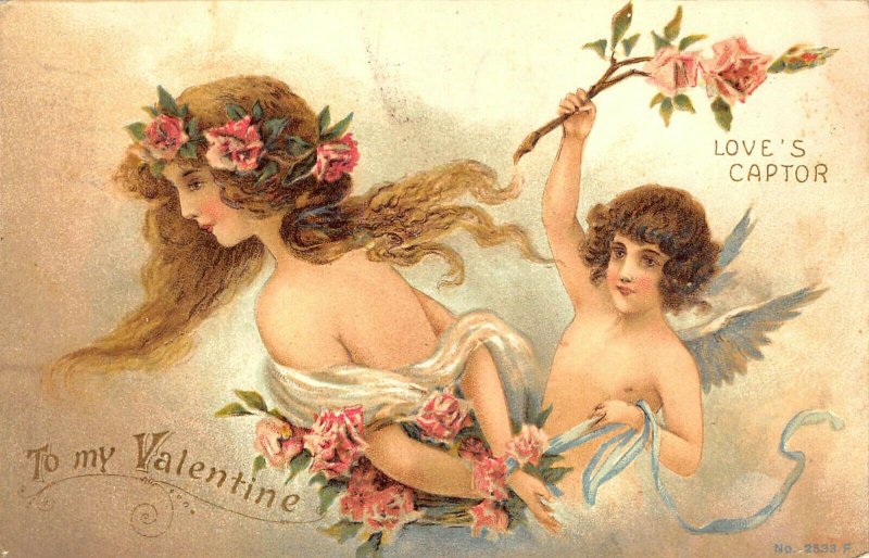 "To My Loves Captor" Carpenters Embossed Valentine, postcard.