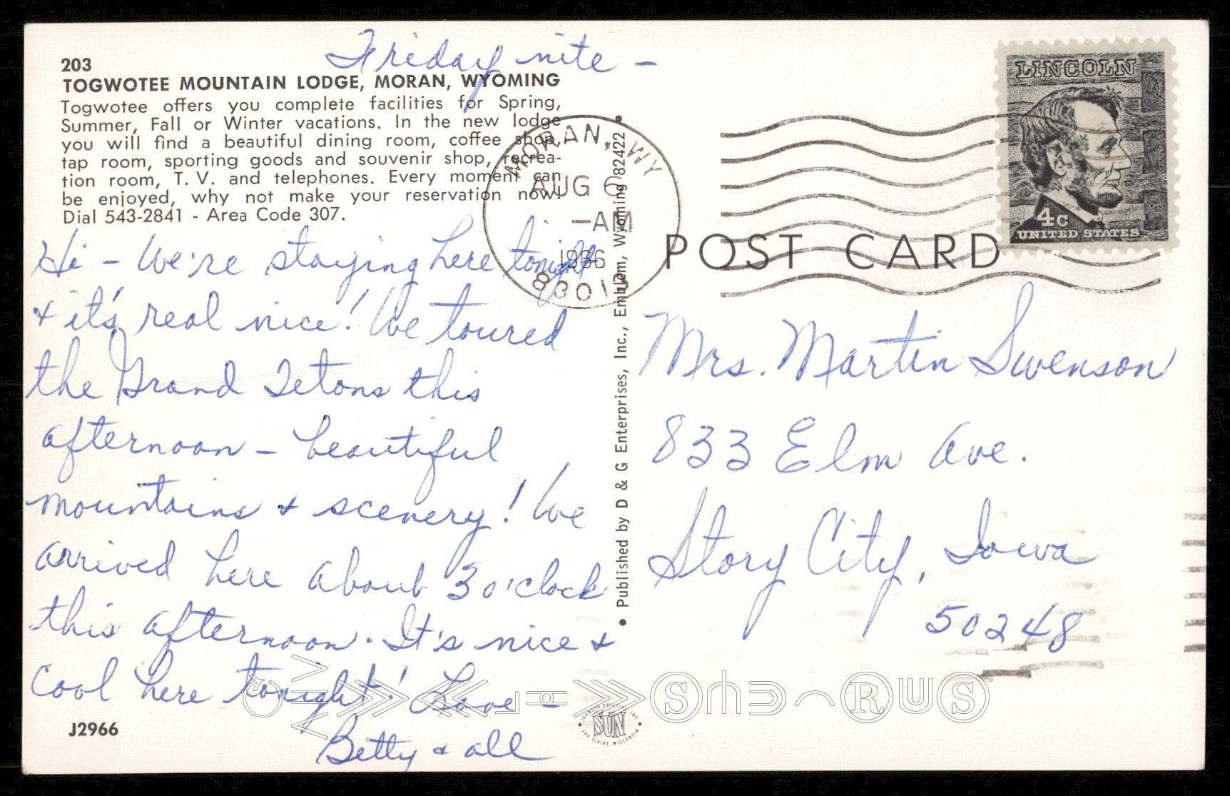 Postmark: Moran, WY Aug 6 1966