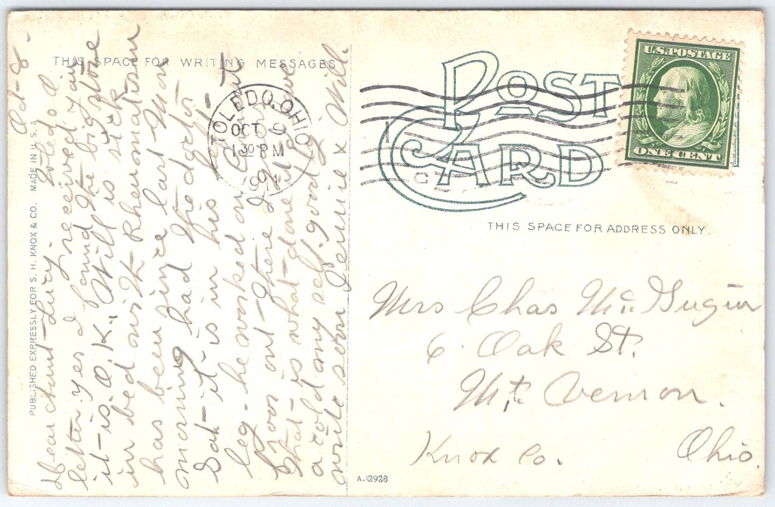 Discover a captivating early 20th-century postcard featuring a panoramic bird's eye view of Toledo, Ohio, as seen from the historic Nicholas Building. This vibrant, hand-colored image captures the bustling urban landscape, showcasing the city's impressive architecture, a prominent bridge spanning the river, and the intricate network of streets that defined Toledo in its early days. The detailed perspective offers a fascinating glimpse into the city's past, highlighting its development and industrial character around the turn of the century.This collectible piece, published expressly for S. H. Knox & Co., is a testament to early postcard printing techniques, with its distinctive divided back and classic design. The scene includes recognizable downtown structures and the expansive Maumee River, making it a significant historical artifact for collectors of Ohioana, urban landscapes, and vintage Americana. It provides a unique window into Toledo's heritage, preserving a moment in time from over a century ago.