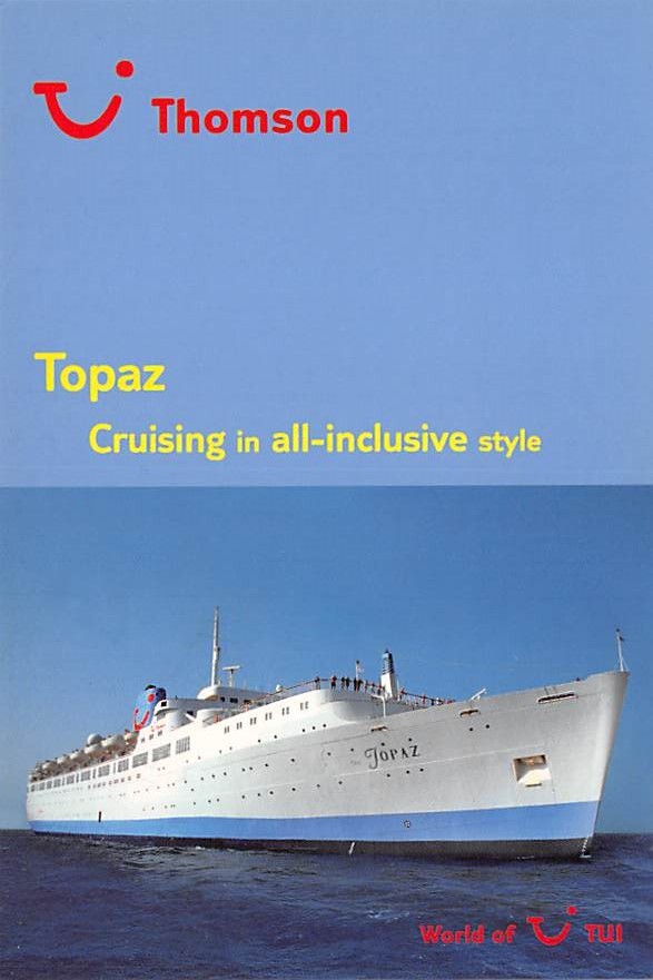 Topaz, Thomson Cruises Postcard View image, Grade: 1, , Size: Continental Size Postcard - approximately 4 inch X 6 inch (15 CM X 10.5 CM) Grading Scale: Grade 1 = Perfect corners Grade 2 = Very Minimal corner w ... Read More