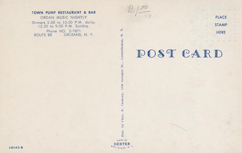 Town Pump Restaurant - Orleans, New York. Standard sized chrome card. My Dad used to joke that he had been to. Town Pump but couldn't find the Pump. Good to very good condition - stray marks address side.