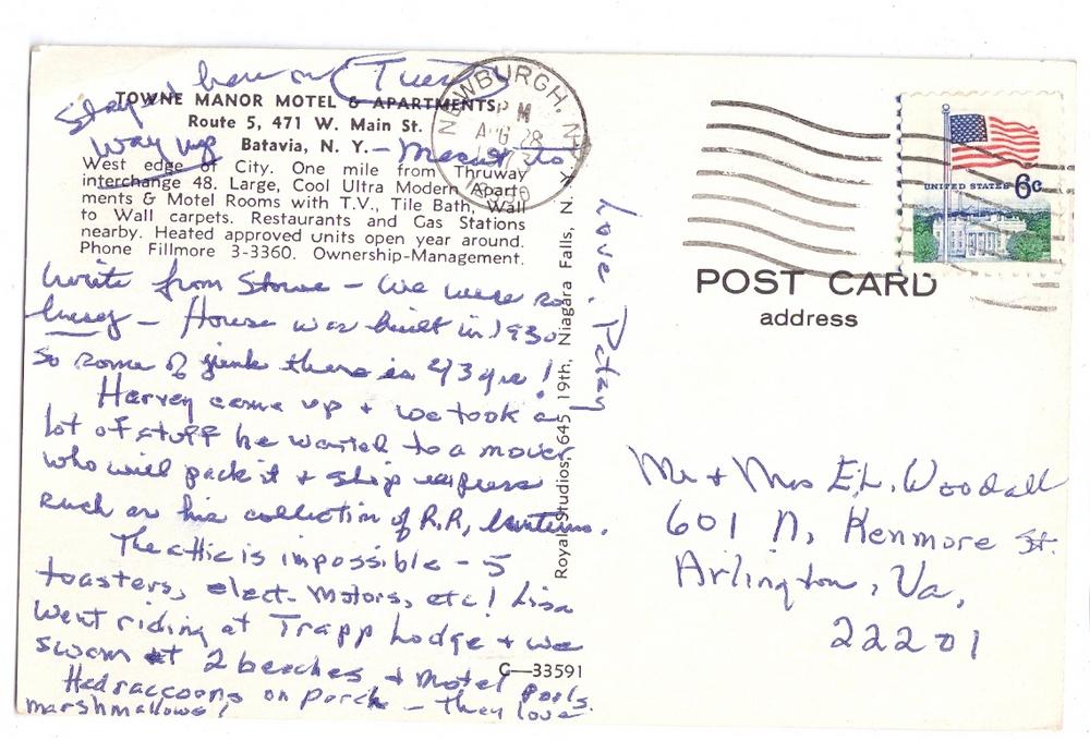 Towne Manor Motel Title: Towne Manor Motel Batavia NY Description: ERA/STYLE 1973 Chrome Publisher: Royal Studios Size: 3.5 X 5.5 Postally Used: Yes Postmark: 1974 Newburgh NY Recipient: Mr. & ... Read More