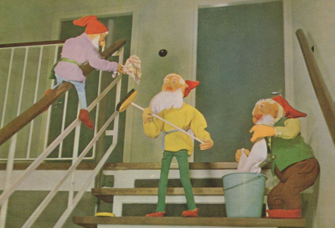 Toy Gnomes Cleaning Stairs Sliding Down Banisters Postcard