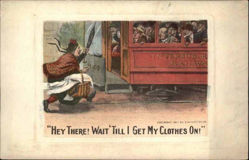 Train Comic Old Fat Woman Running Late Laundry Basket c1910s Postcard