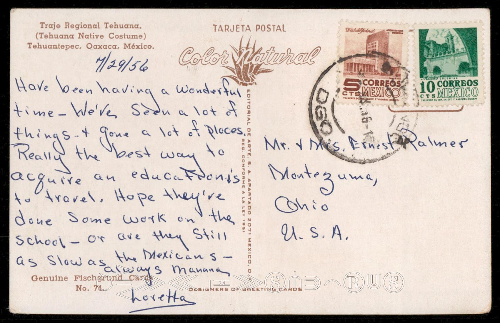 Title: TRAJE REGIONAL TEHUANA Condition: See scans Year: 1956 Postmark: DGO Jul 1956 Publisher: S.A. Apartado Keywords: Tehuana Native Costume Tehuantepec, Oaxaca # 74 Related Categories: America > Mexico T ... Read More