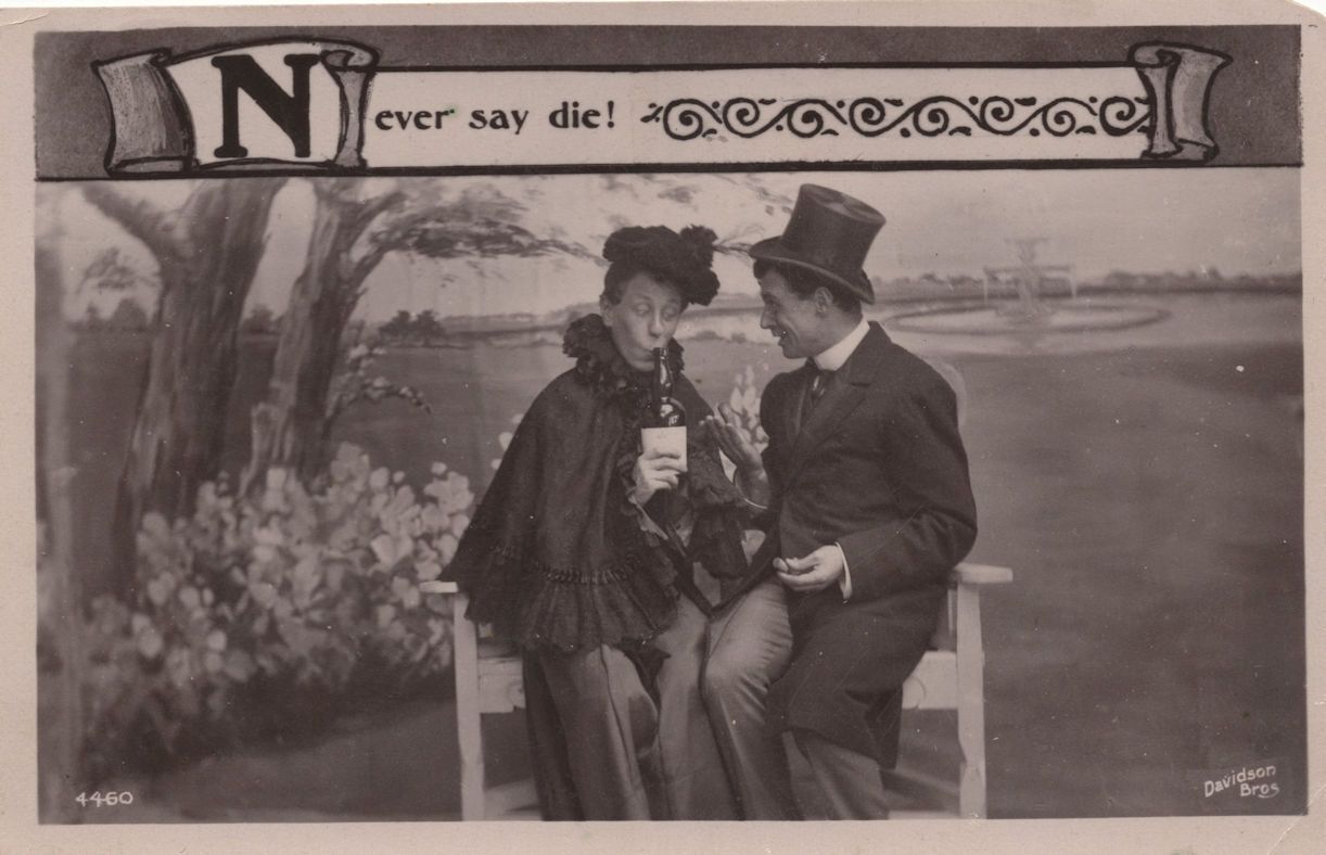 bg522 Antique 1920s real photo postcard of this transvestite and a Charlie Chaplin type man giving her a bottle of beer - she is getting very intoxicated and this card has such character unused in great condition (ex minus)