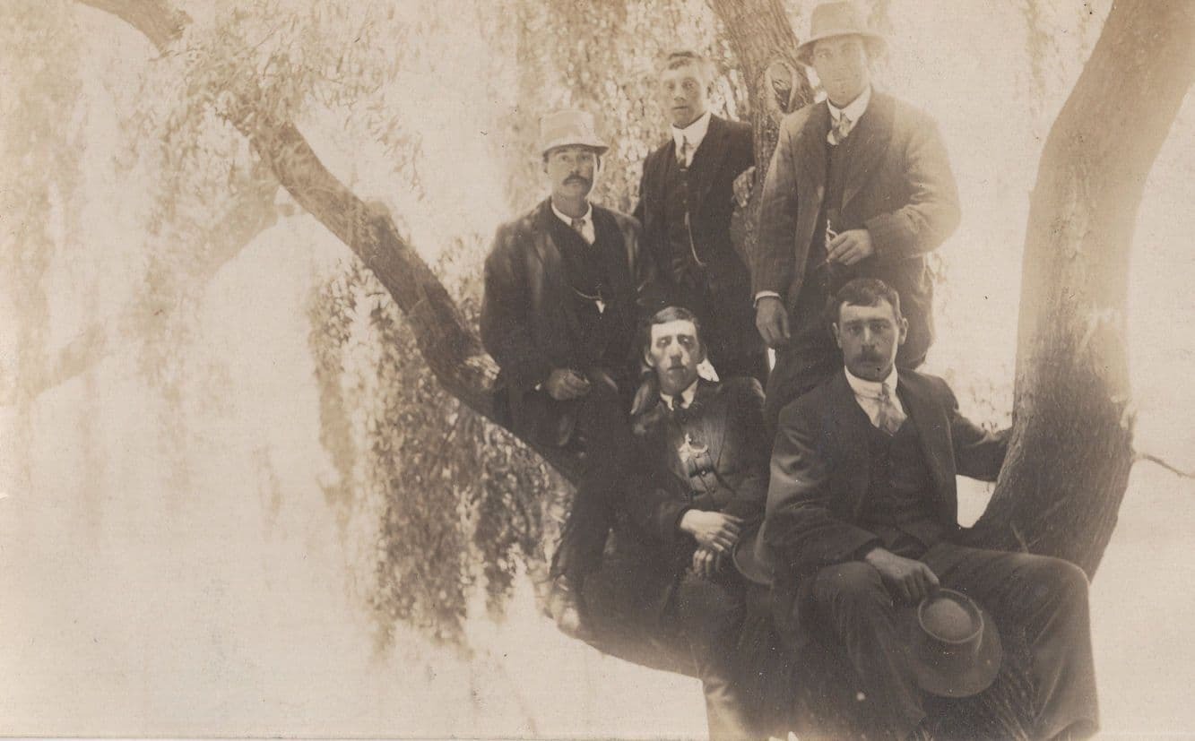 ZX317 Amazing pre 1910 postcard real photo of this tree climbing trip where all the climbers are balancing on the same branch.. how does it hold their weight ?? Dates to around 1910 or earlier - Some age fading, and some small places but otherwise great used condition. (vg+). You wont find a postcard like this again !!