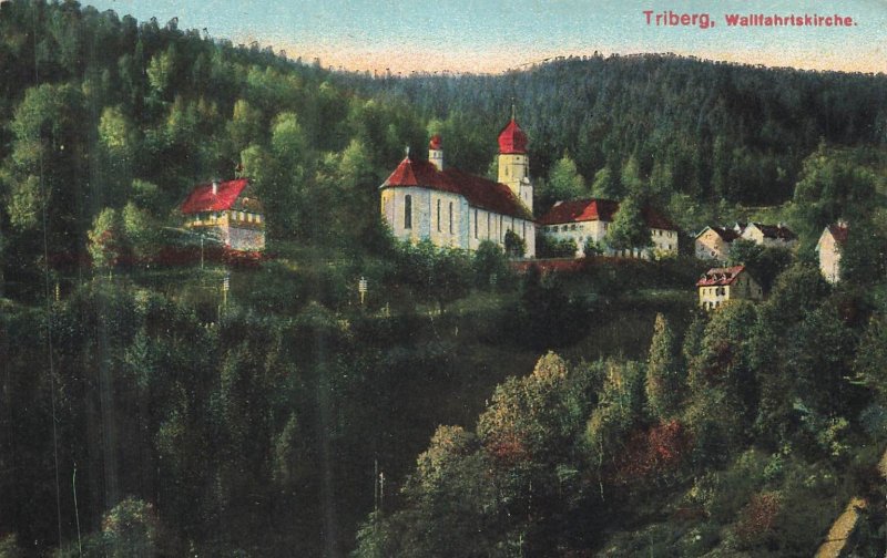 This captivating vintage postcard features the historic Wallfahrtskirche (Pilgrimage Church) nestled amidst the lush, verdant forests of Triberg, Germany. The scene depicts the picturesque church with its distinctive red-roofed towers and white facade, standing prominently on a hillside surrounded by the dense Black Forest landscape. Smaller accompanying buildings are scattered throughout the natural setting, conveying a sense of serene beauty and historical significance within this renowned German region.Published by Gustav Carle of Triberg, this postcard is a fine example of early 20th-century printing, likely utilizing a chromolithographic technique to achieve its vibrant yet subtle coloring. The detailed illustration captures the architectural charm of the church and the natural grandeur of the surrounding woodland, making it a wonderful piece for collectors interested in German history, religious landmarks, or the scenic beauty of the Black Forest.