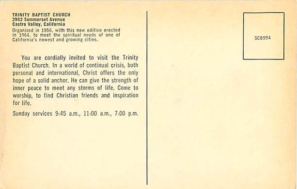Trinity Baptist Church Castro Valley California CaType of Postcard: STANDARD SIZE CHROME