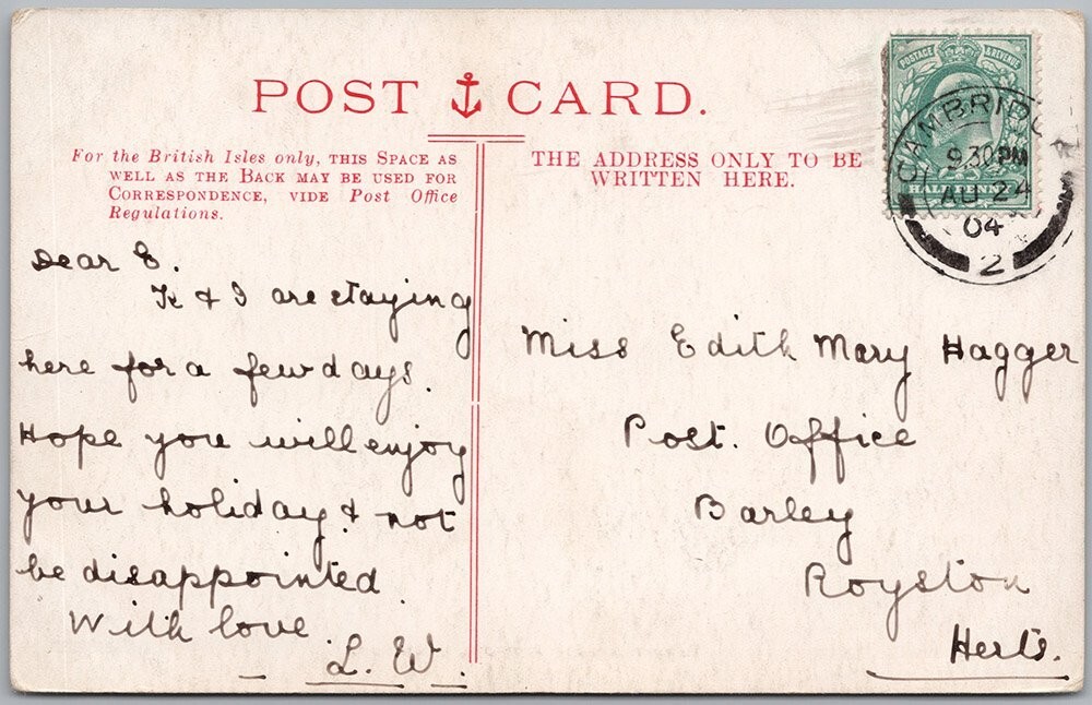 Trinity College Gateway Cambridge England Postcard 1904 Postmarked H83Please zoom into and look closely at the front and back photos to view condition and feel free to send me a message if you have any questions. Thanks kindly for viewing, D