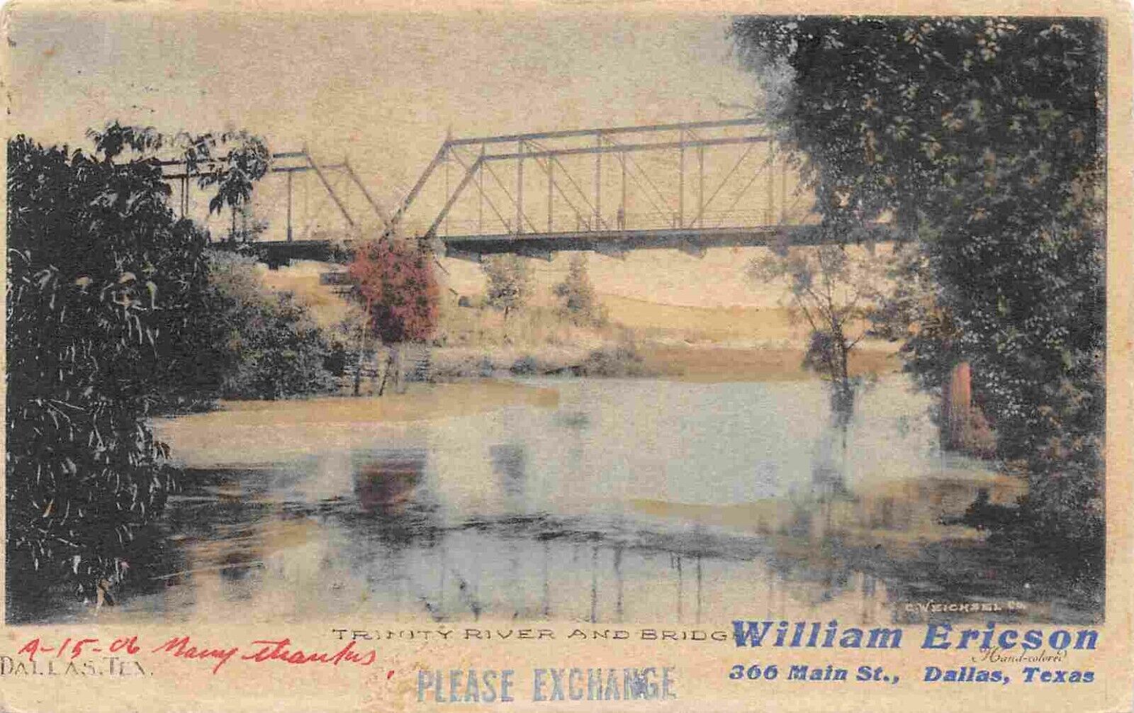 Trinity River Bridge Dallas Texas 1906 hand colored postcard