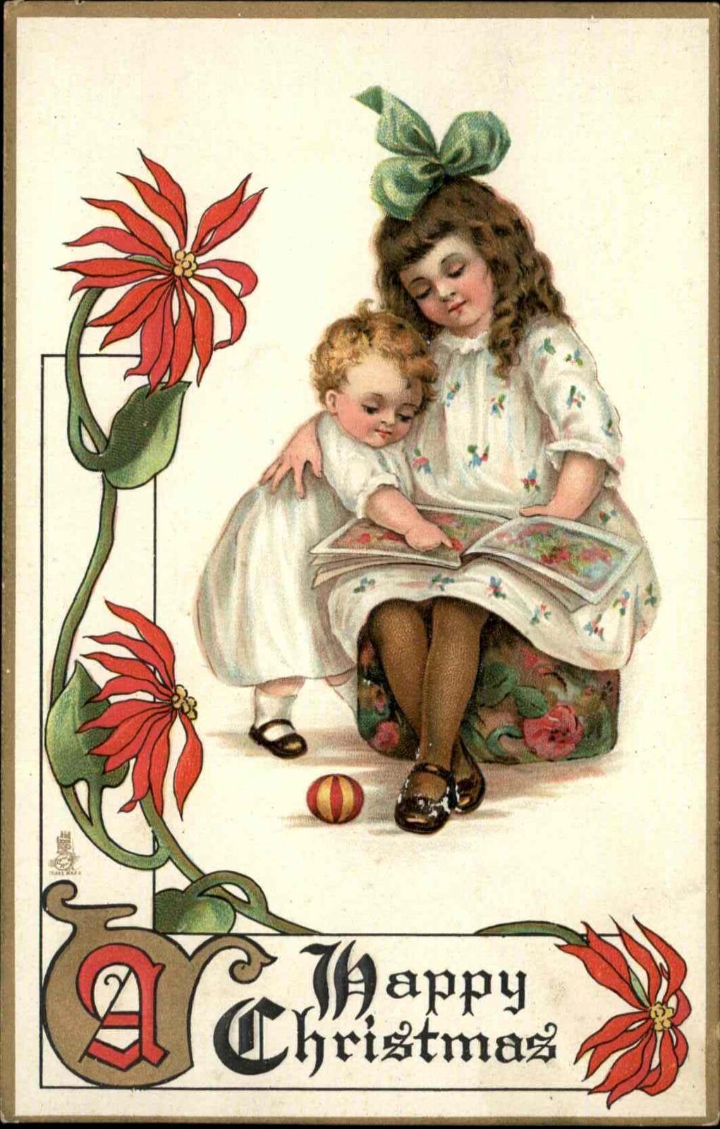 Tuck Christmas Children No. 540 Sisters with Picture Book c1910 Postcard