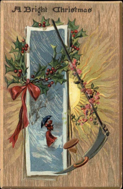 Tuck Oak Panel Christmas Woman in Snow Scythe Hourglass Holly c1910 PC