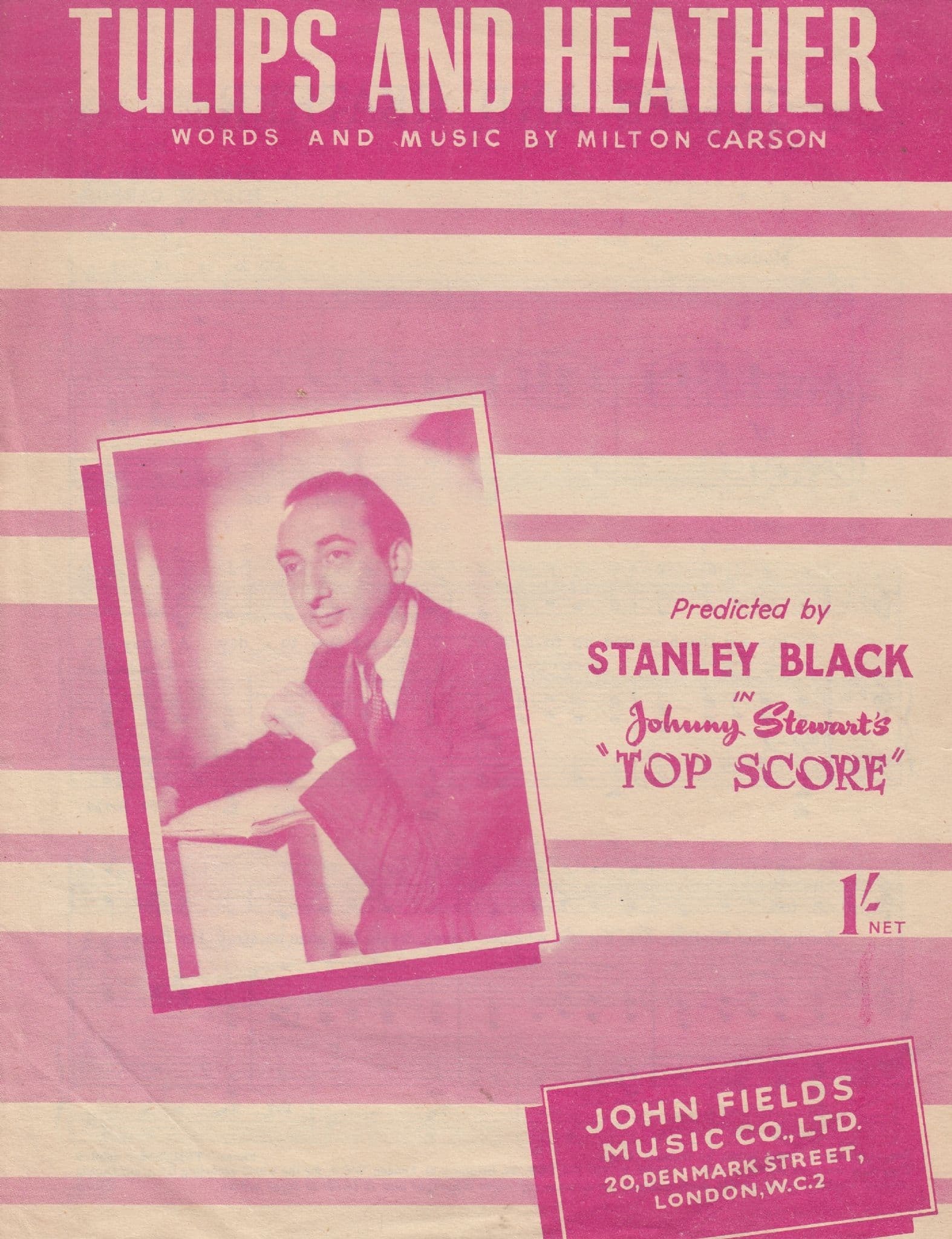 This is a vintage 1950s sheet music for Tulips & Heather - please do not confuse with other versions as this is the cover with Stanley Black - it has a used appearance with some creasing and my grading is fair plus to good minus - back page has the sheet music all printed in pink - this is a rare character score