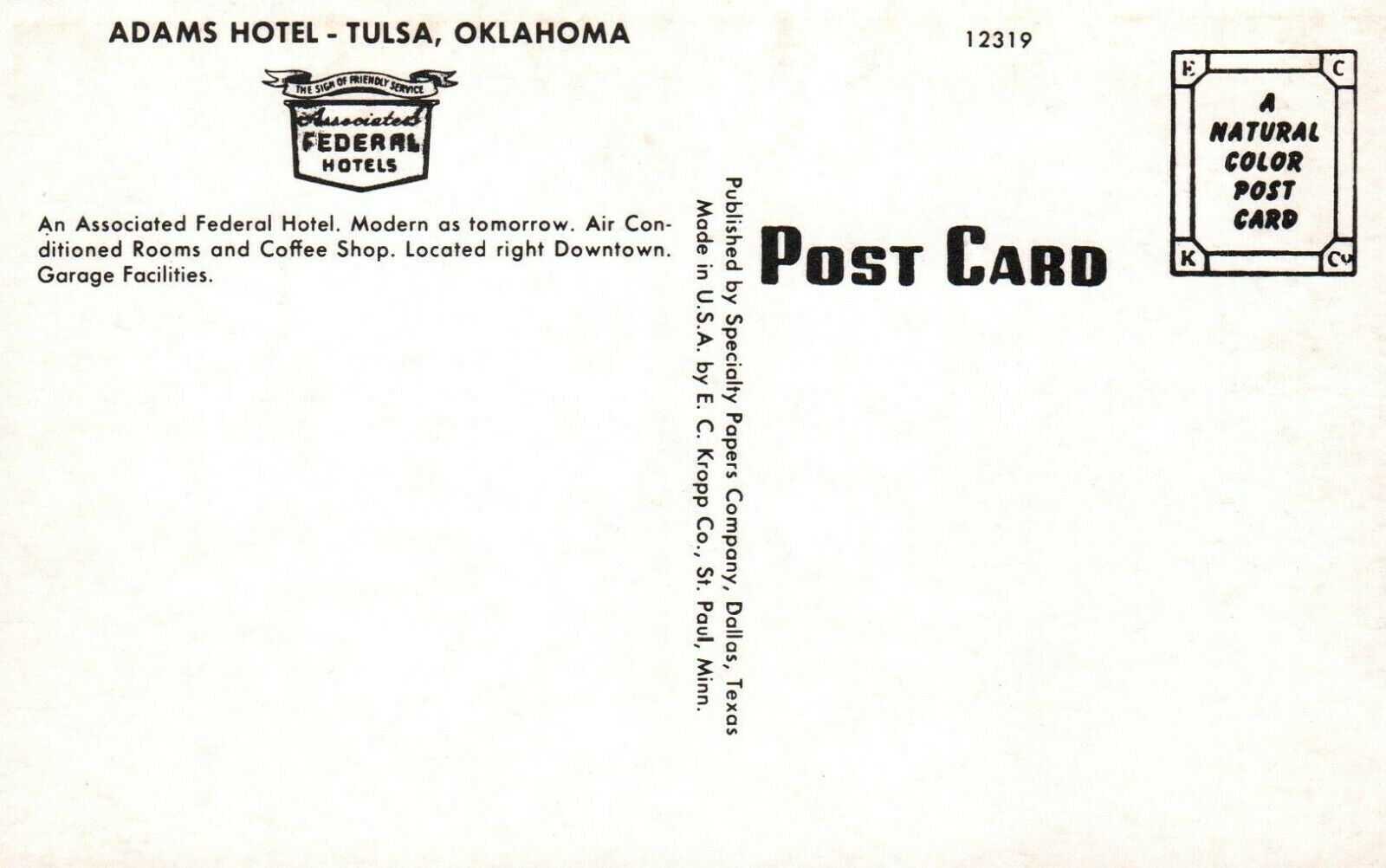 Tulsa Oklahoma Adams Hotel Postcard