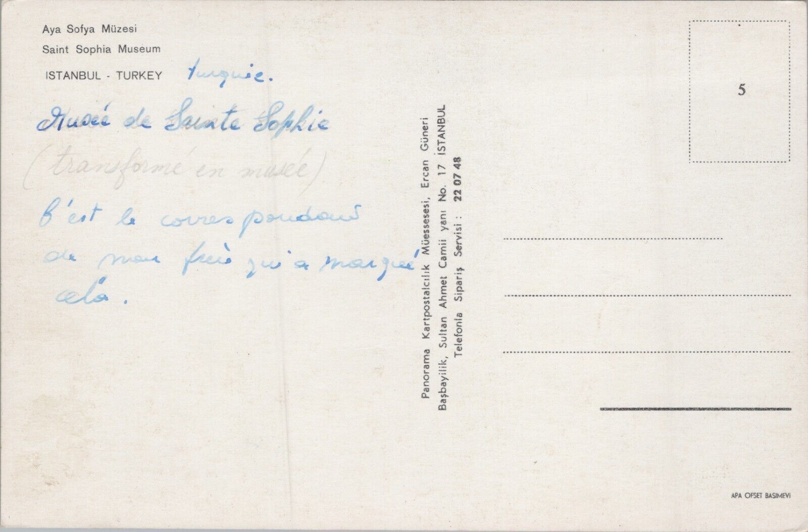 Condition: Look at the pictures for quality. This vintage postcard features a view of the Saint Sophia Museum in Istanbul, Turkey. The postcard is an original printed lithograph on paper and has not been posted. T ... Read More