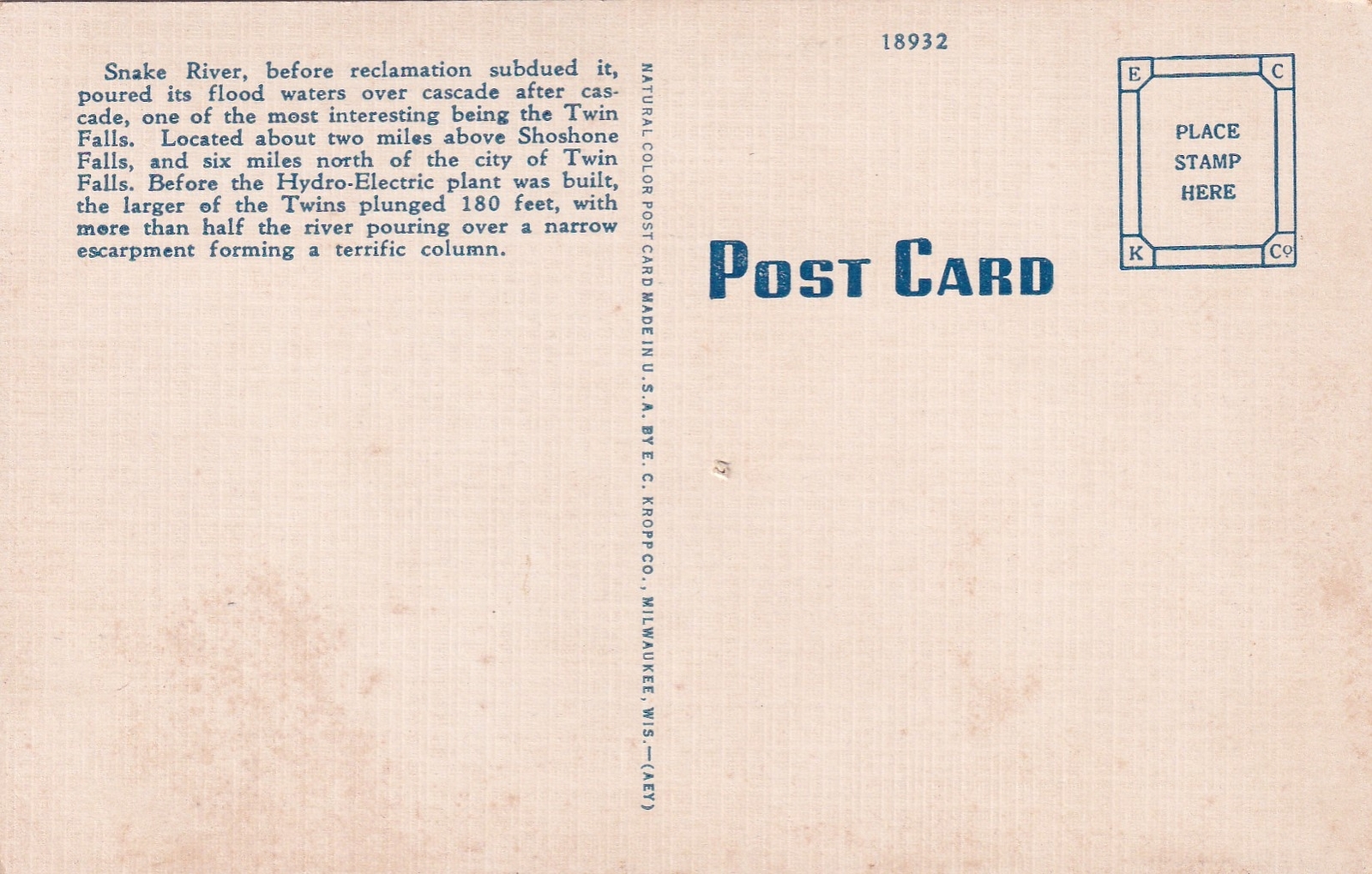 Condition: See photos Twin Falls Idaho ID Snake River Postcard D13 Twin Falls Idaho ID Snake River Postcard D13 Our large front and back scans show you the exact condition of this postcard. Size: Approx. 5.5" x 3. ... Read More