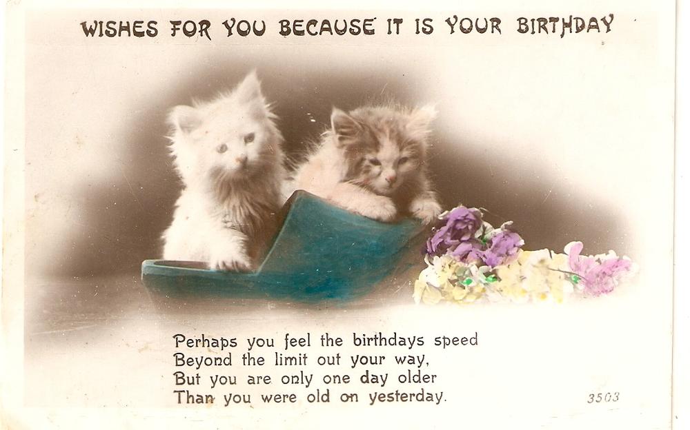 \"Two Birthday Kittens\" Nice antique English cat postcard
