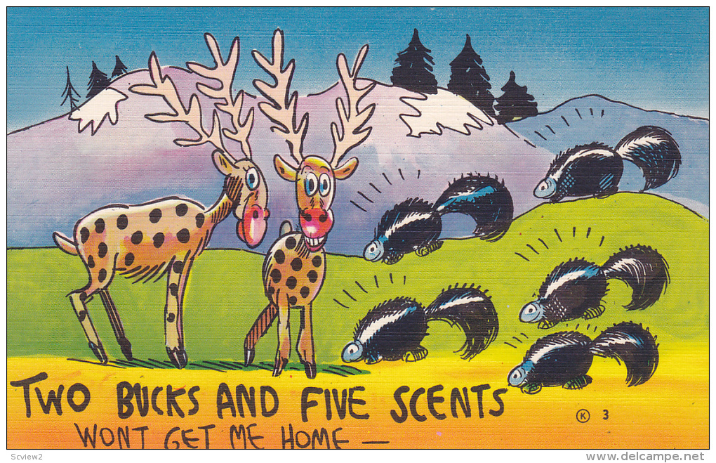 Two Bucks and Five Scents Won't Get Me Home, Skunks, 30-40s :: Postcard, 3.5" by 5.5", Linen, EX