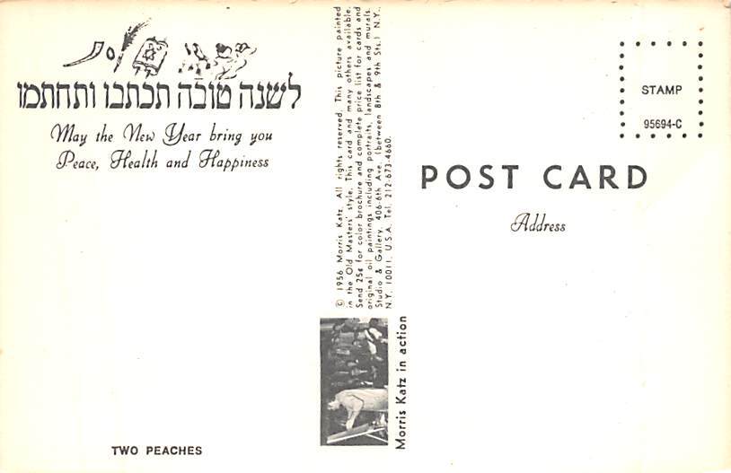 Two Peaches Artist Morris Katz Postcard Unused, Grade: 5 - big crease, , Size: Regular Size Postcard - approximately 3 1/2 inch x 5 1/2 inch (9 CM x 14 CM) Grading Scale: Grade 1 = Perfect corners Grade 2 = Ver ... Read More
