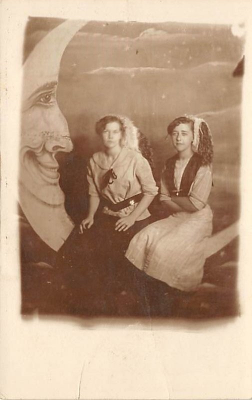 Two Women Posing on Moon Backdrop Postcard Two Women Posing on Moon Backdrop,