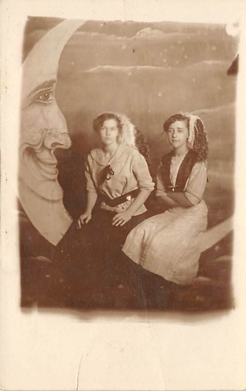 Two Women Posing on Moon Backdrop Postcard Two Women Posing on Moon Backdrop, Grade: 4 Size: Regular Size Postcard - approximately 3 1/2 inch x 5 1/2 inch (9 CM x 14 CM) Grading Scale: Grade 1 = Perfect corners ... Read More