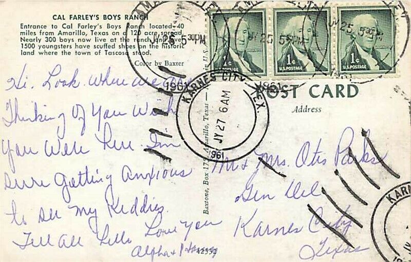 Amarillo, Texas, Cal Farley's Boys Ranch Chrome Postcard Postmark: 1961 Publisher/Printer: Baxton Image: Bright and clean Corners: Light wear, wear top left Faults/Other:
