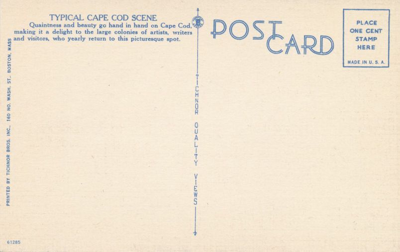 Typical Cape Cod Scene, Massachusetts - Quaintness and Beauty. Standard sized linen post card. Tichnor Quality Views of Boston. Very good condition.
