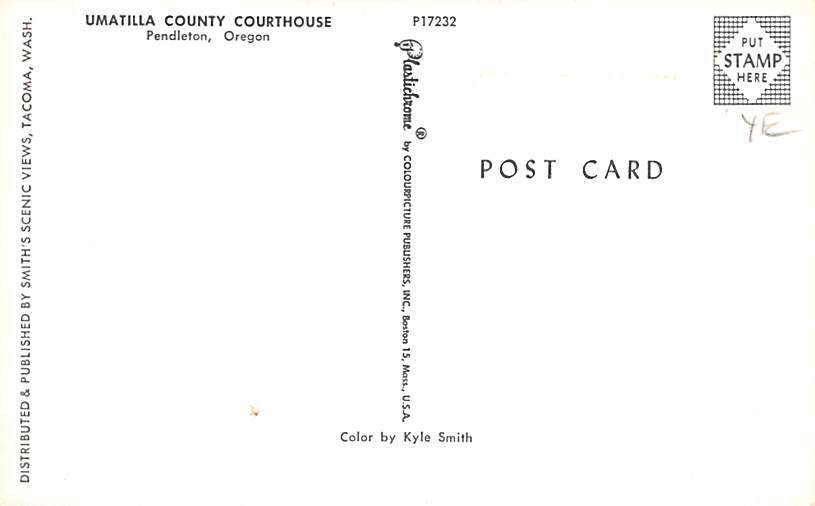 Umatilla County Courthouse Pendleton, Oregon OR Postcard Postal Date: Unused Grade: 1 Size: Regular Size Postcard - approximately 3 1/2 inch x 5 1/2 inch (9 CM x 14 CM) Grading Scale: Grade 1 = Perfect corner ... Read More