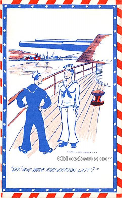 Uniform Military Comic Postcard Unused, Grade: 1, , Size: Regular size: Approx 3 1/2 X 5 1/2 inch (9 cm X 14 cm) Grading Scale: Grade 1 = Perfect corners Grade 2 = Very Minimal corner wear, no creases Grade 3 ... Read More